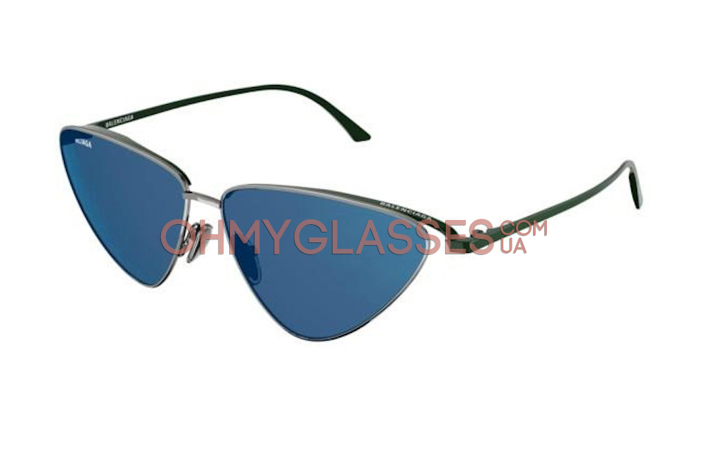 Солнцезащитные очки «кошки» Balenciaga BB0162S 003 исполнена в зеленой металической оправе с синими линзами из поликарбоната, а так же деталировками в виде фирменных логотипов на дужках, отлично дополнят любой образ.