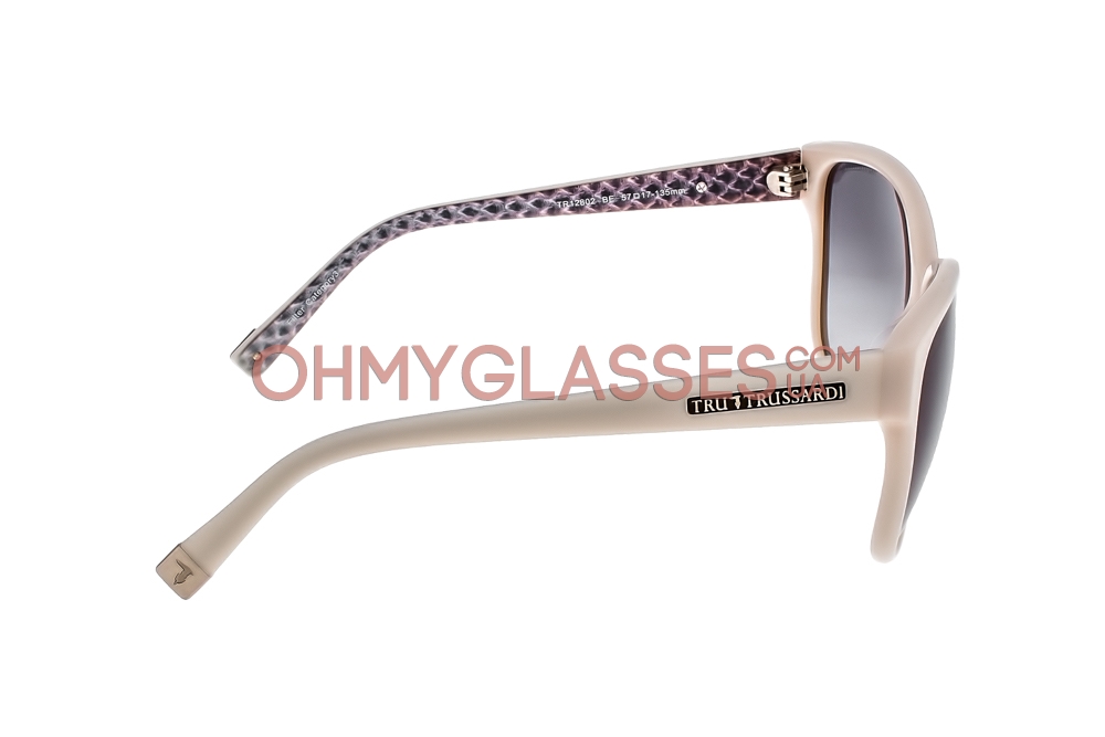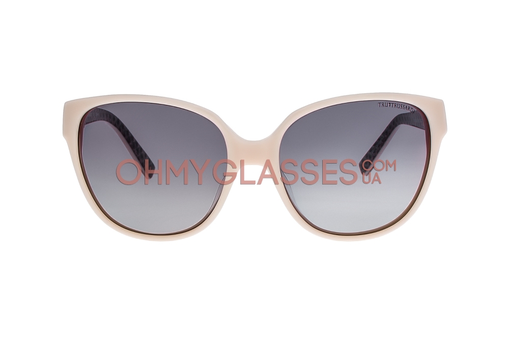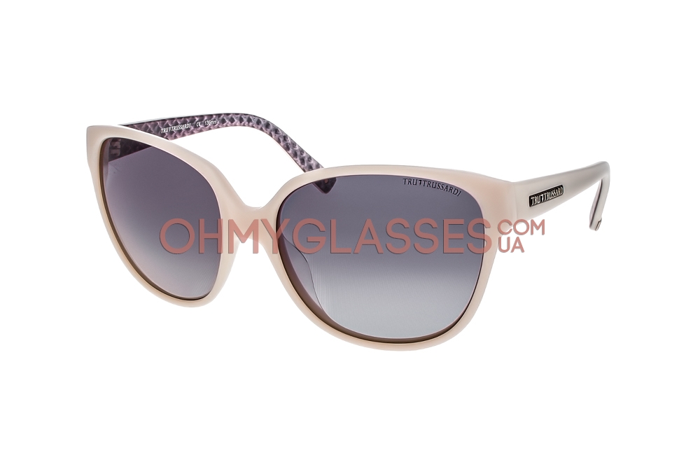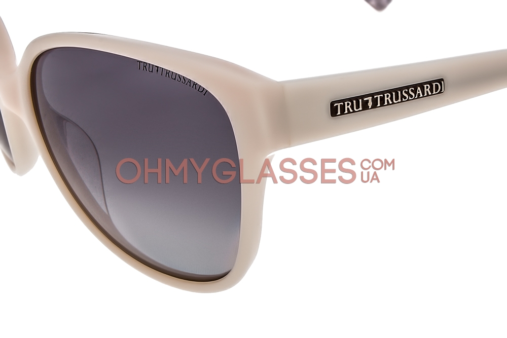 Солнцезащитные очки «кошки» Trussardi TR12802 BE исполнены в молочной оправе с голубыми градиентными линзами из поликарбоната, а так же деталировками в виде фирменных логотипов TR, отлично дополнят ваш яркий стиль и неповторимый образ.
